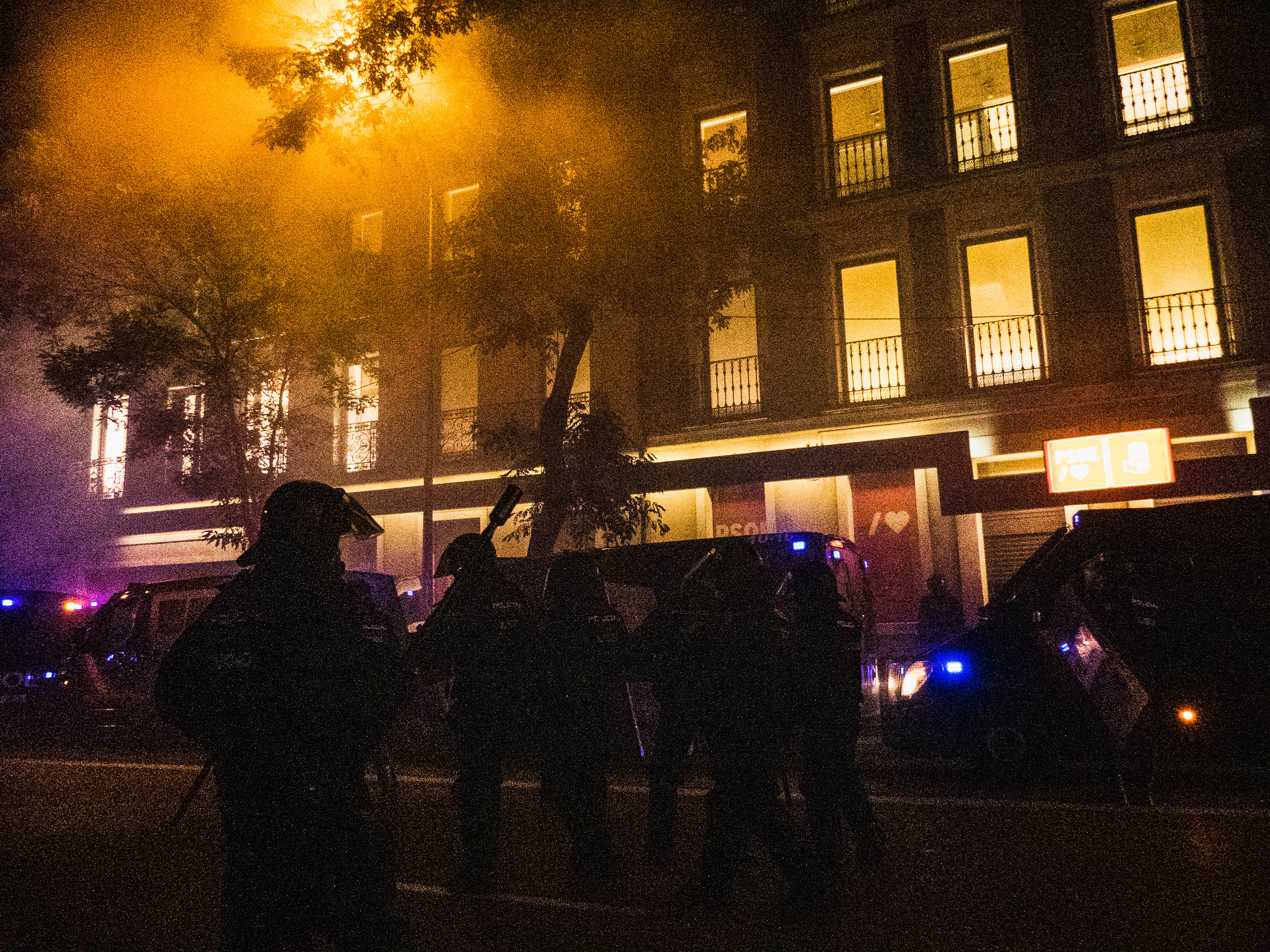 Tres detenidos, cargas policiales con gas lacrimógeno y disturbios alrededor de la sede del PSOE en Madrid